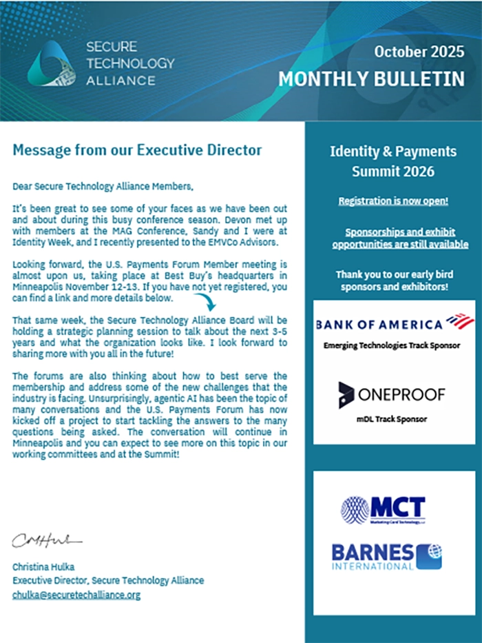 This monthly news bulletin is distributed to all interested parties and covers key Alliance organization announcements, plus industry and member news. If you are a Secure Technology Alliance member and do not receive this newsletter, please email us to be added to the mailing list. Read past issues here: